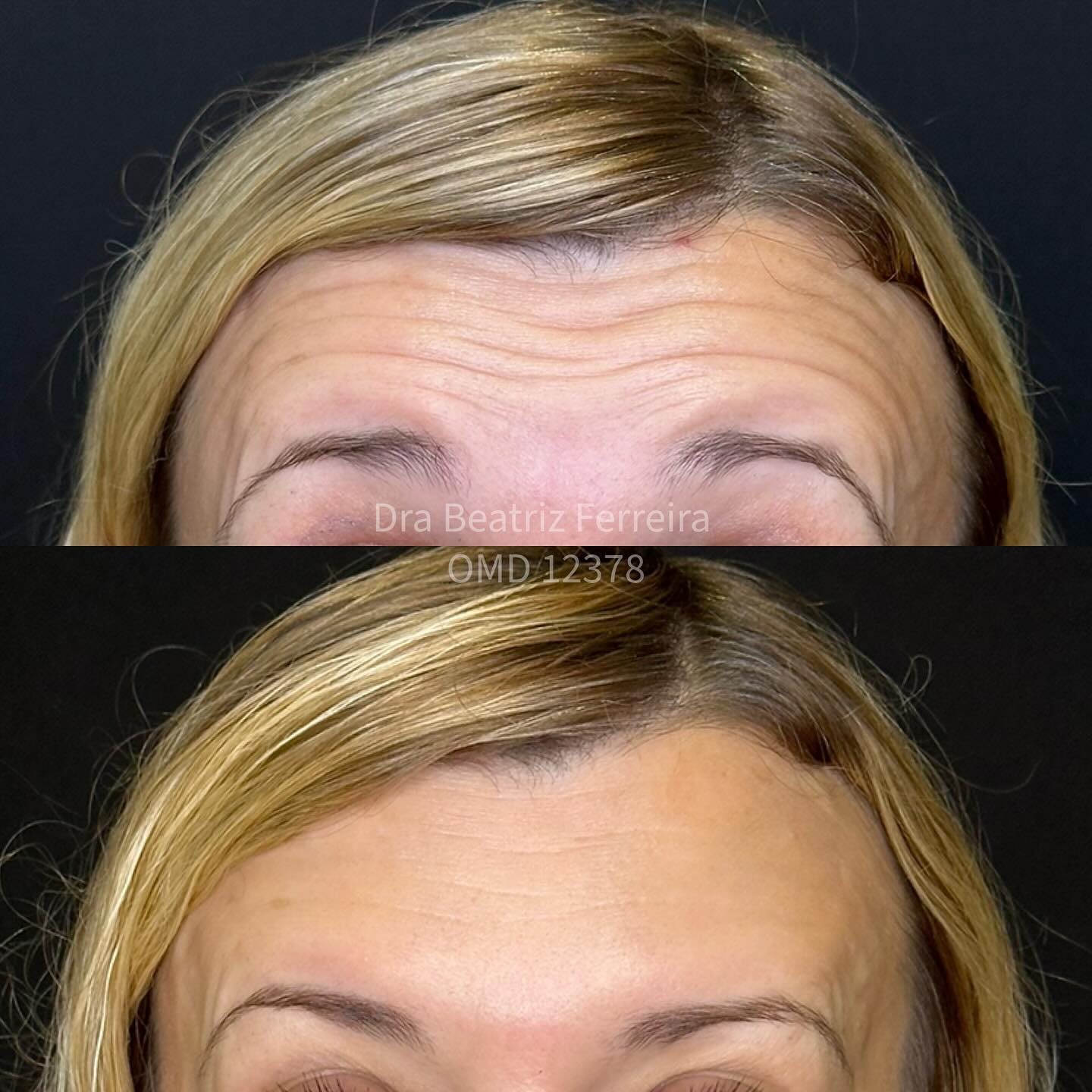 Neste caso conseguimos não só suavizar as rugas de expressão na testa, como também fazer um efeito lifting das sobrancelhas.